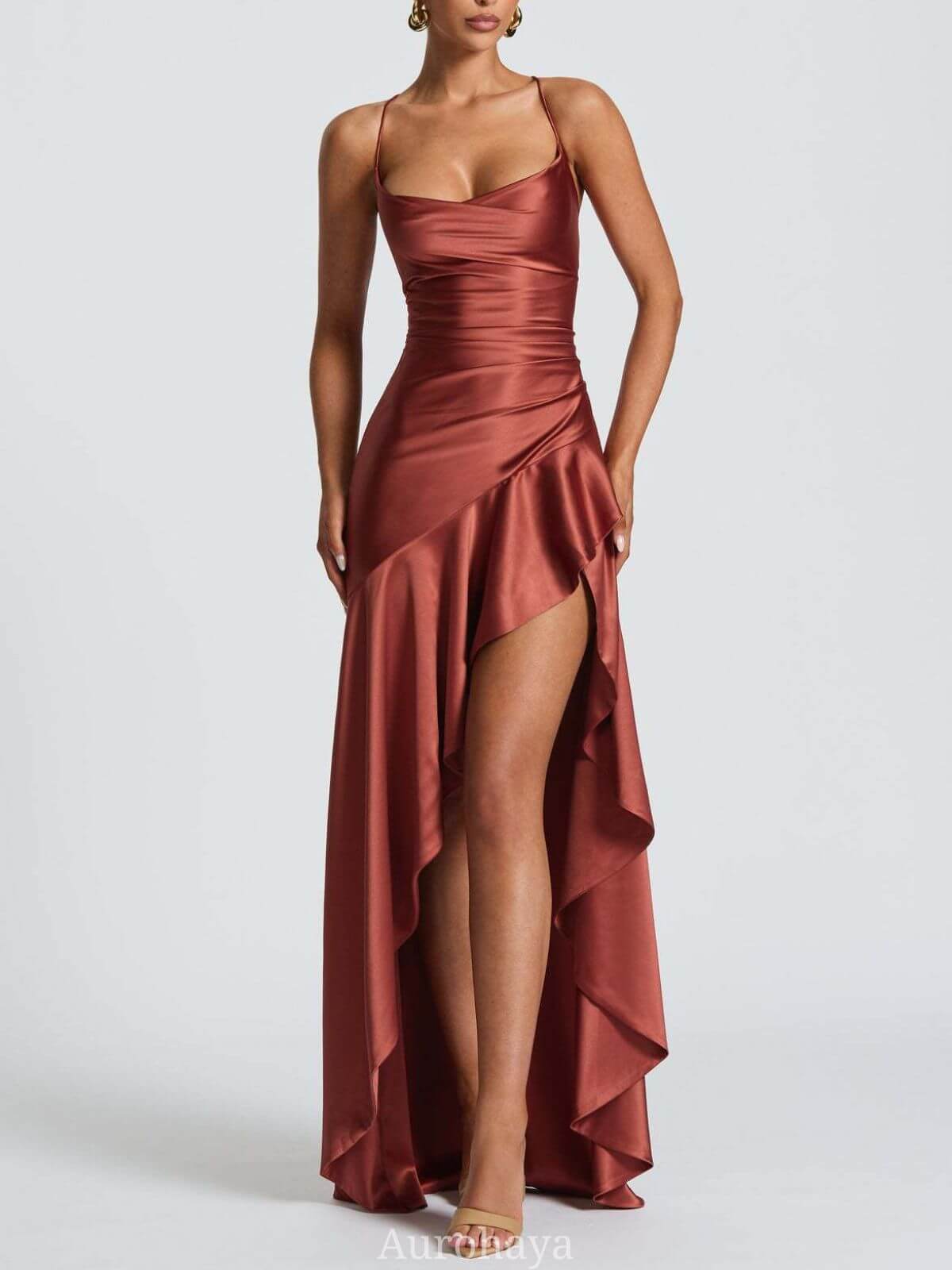 A draped thigh-high split adds a bold yet refined statement, while the irregular hem and soft ruffle detailing create graceful movement with every step. The ruched satin construction and asymmetric design make this dress ideal for evening events, formal occasions, weddings, cocktail parties, prom nights, and upscale dinners. Designed in a full maxi length, it balances sophistication with a contemporary silhouette.