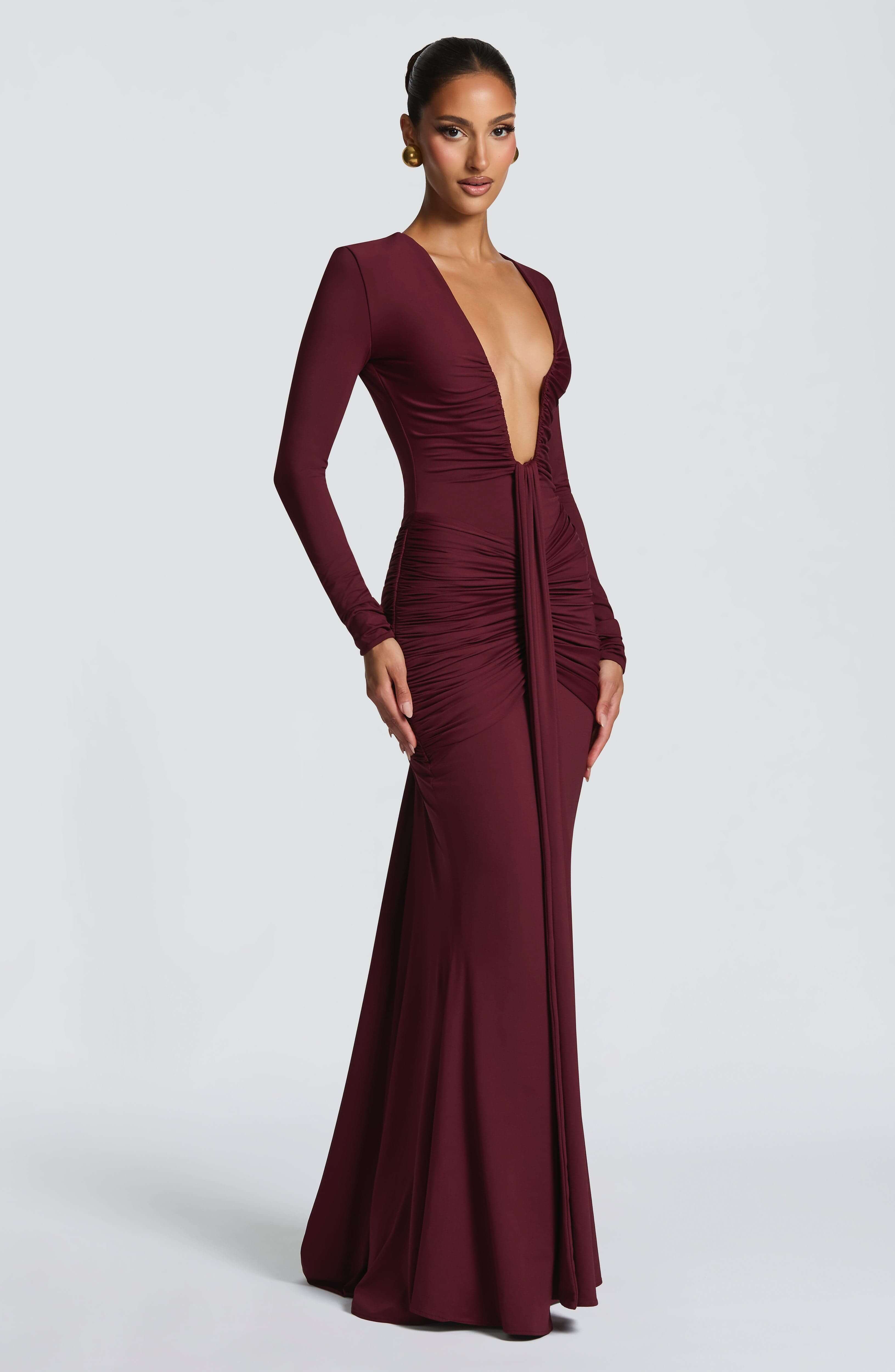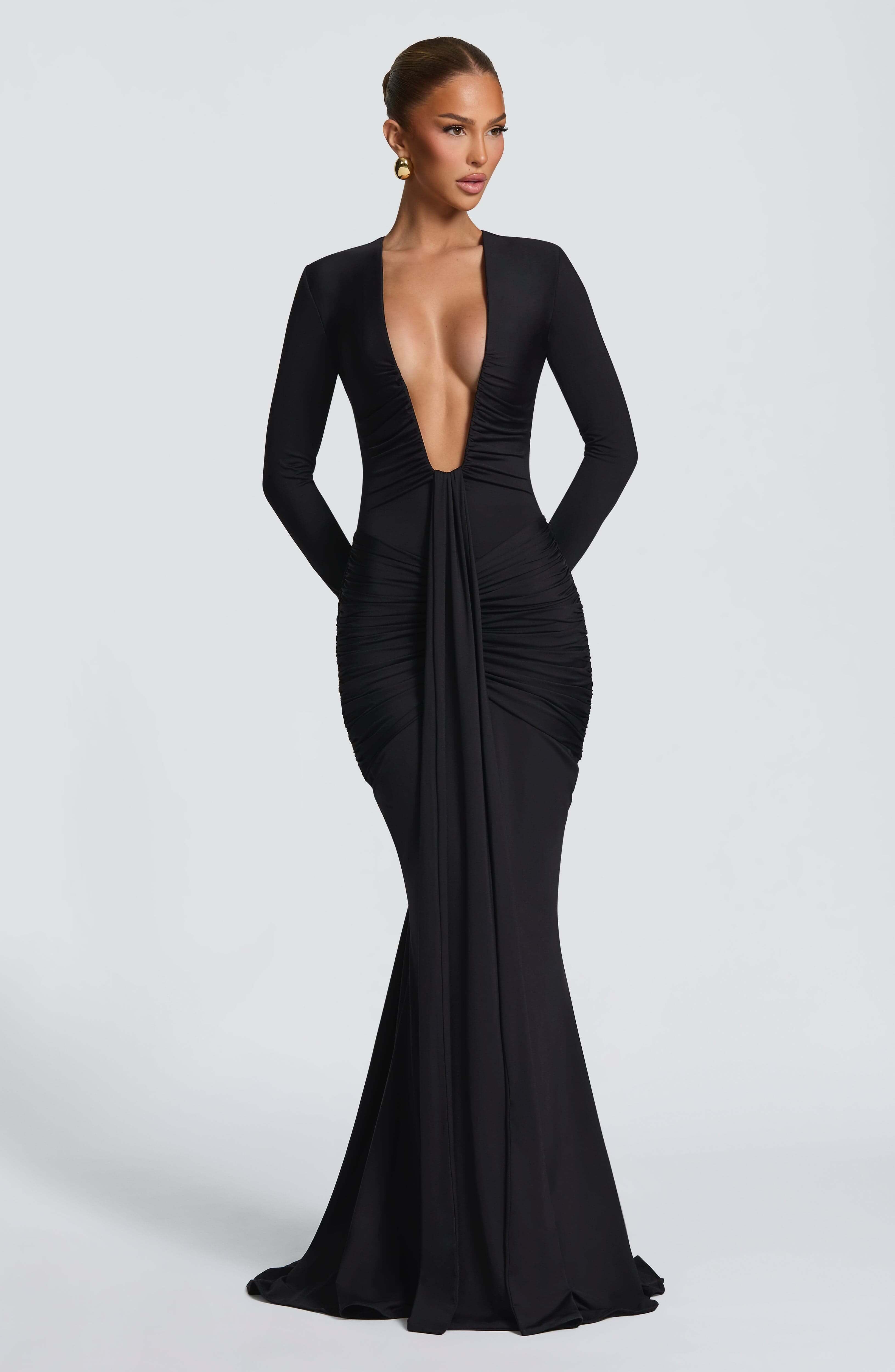 Eléonore Deep-plunge ruched mermaid maxi dress in stretchy slinky jersey — fully lined, maxi length with fitted long sleeves and a U-wire deep plunge neckline. Featuring ruched detail around the neckline and a ruched panel across the hips, this pull-on gown has a dramatic long draped center-front panel and a mermaid-shaped skirt with train. No zipper.