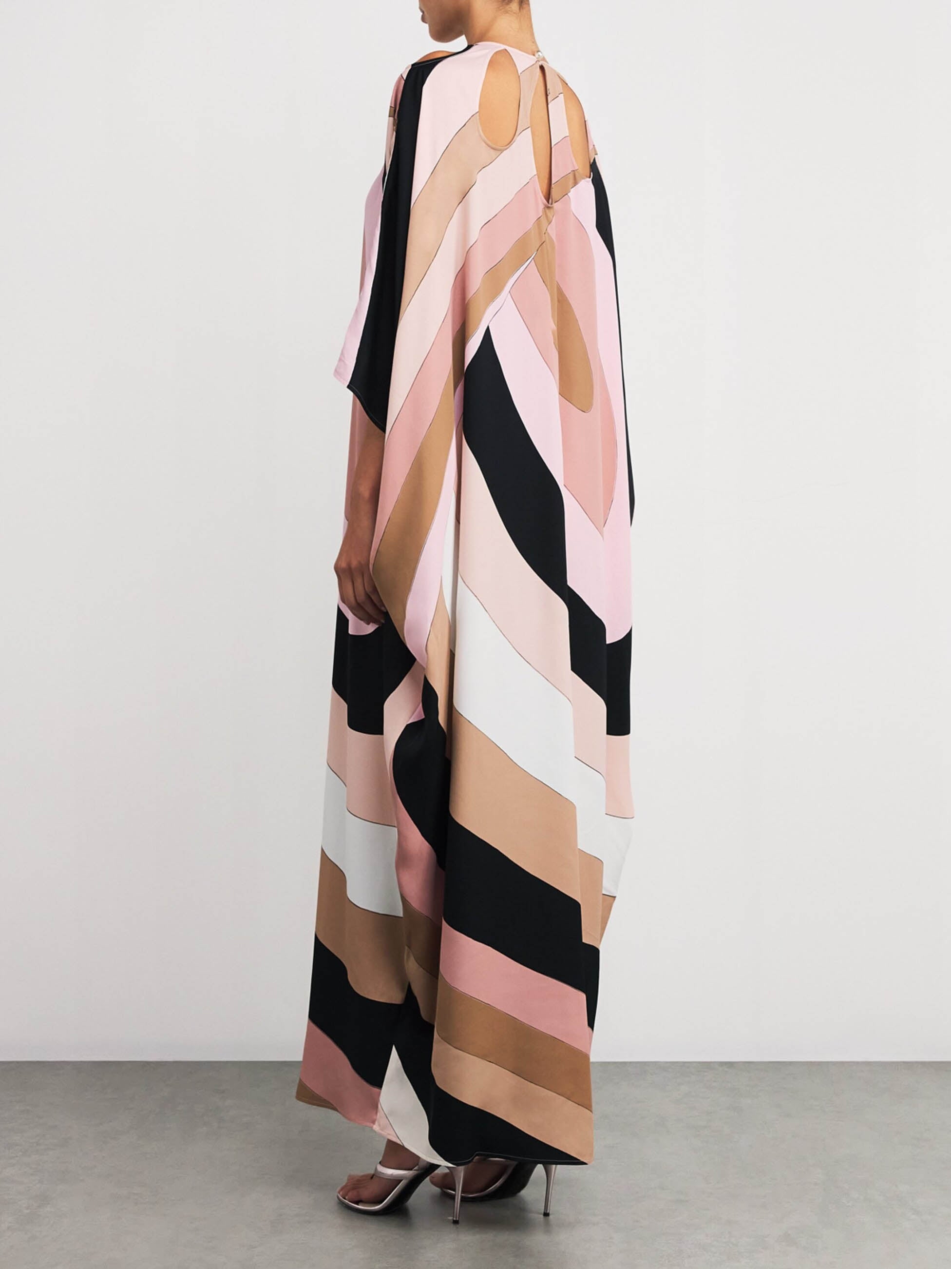 This exquisite satin maxi dress, embellished with a sleek, striped print and three elegant teardrop-shaped cutouts, will make a statement.